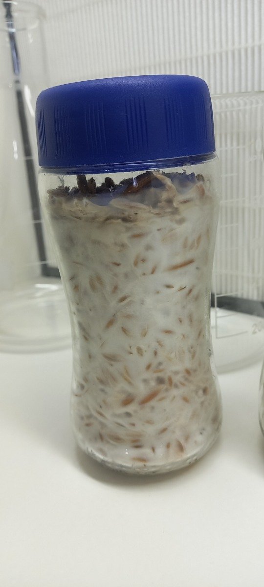 Frasco chico semilla golden teacher listo para inocular en sustrato